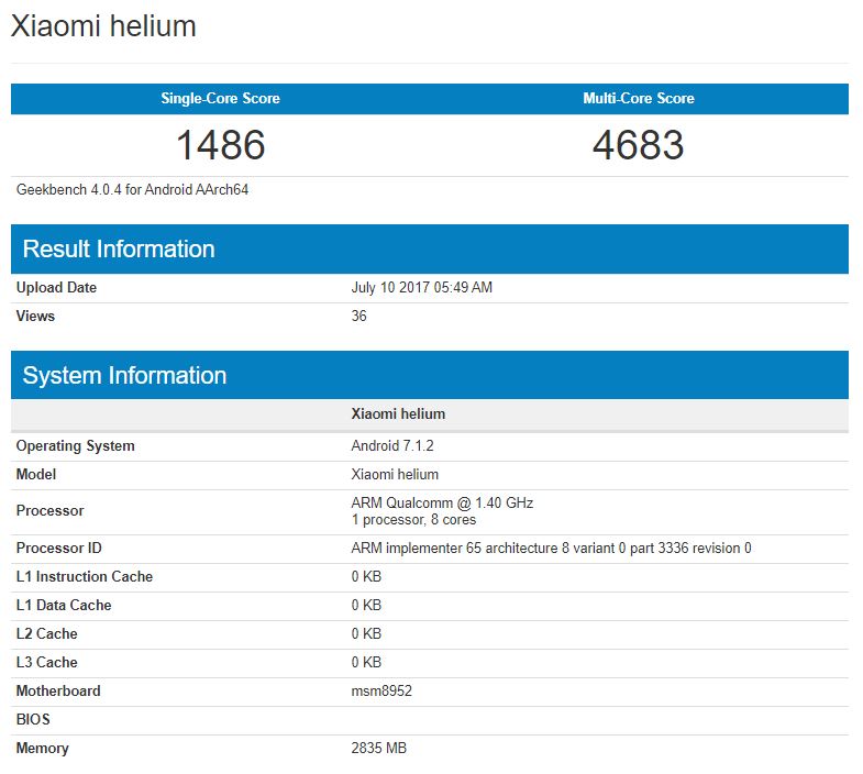 Xiaomi Helium is definitely not the real name but a codename for the model but according to the benchmark data displayed, the model would be powered by a mid-range Qualcomm Snapdragon 617 chipset which is identified by the msm8952 alias it is listed with. The CPU is an Octa-core chip clocked at 1.40GHz. The Xiaomi Helium is also listed to feature the latest build of Android 7 Nougat but this isn’t likely to be raw Nougat. The device will most definitely have a touch of the latest version of Xiaomi’s custom MIUI ROM.
