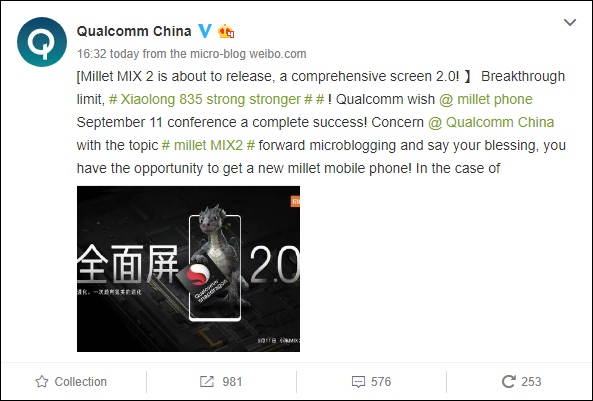 It is already a regular in leaks and rumors that the Mi Mix 2 will utilize a Snapdragon 835 processor but this goes to confirm that indeed Qualcomm’s latest chip would be found on board the Mix 2. Apart from confirming the chipset, the Weibo post also teases the Mix 2 as coming with full-screen 2.0. Until Xiaomi unveils the device we can’t fully comprehend what that means but we sure do expect the Mix 2 to take the bezel-less full display technology used on the Mi Mix to a different level.