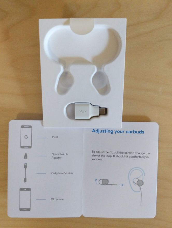 Lucas Everett has shared the images of Pixel 2 box package that he received on his Twitter account. By looking at the images form the booklet, it appears that Google had considered including a wired earphone with a USB-C connector along with inline controls. The design of the wired earbuds appears quite similar to the wireless Pixel Buds that are sold separately by Google.
