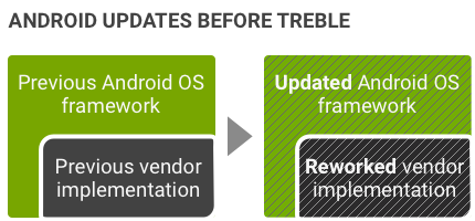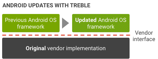 It does this by separating the vendor implementation (device-specific, lower-level software written by silicon manufacturers) from the Android OS framework via a new vendor interface. In previous Android versions. device makers had to update most of the Android code to upgrade a device to a newer version of Android. But with project treble, the stable vendor interface provides access to the hardware-specific parts of Android, so that manufacturers can push out new Android updates by just updating the Android OS framework.