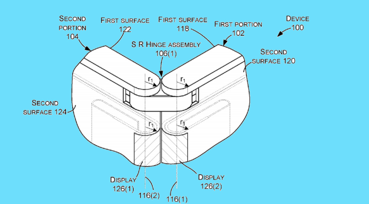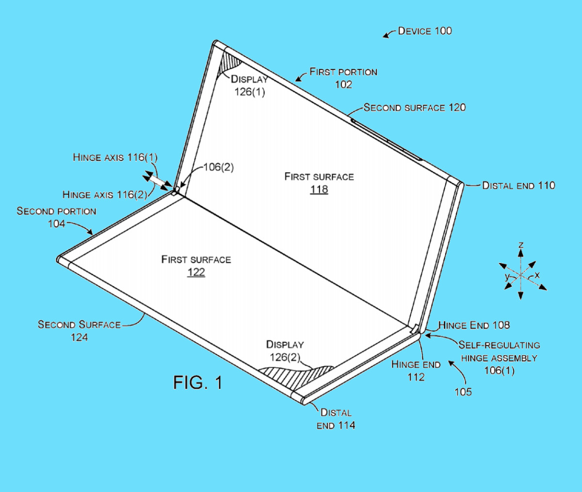 A new design patent surfaced at the USPTO: a 2-in-1 device with a self-regulating hinge. This is what can be found in the description: “pair of self-regulating hinge assemblies rotatably securing hinge ends of the first and second portions around a first hinge axis associated with the first portion and a second hinge axis associated with the second hinge axis so that an extent of rotation around the first hinge axis corresponds to an extent of rotation around the second hinge axis”. The alleged Microsoft Surface Phone includes two displays which can become one, and it can also be used with a physical keyboard.