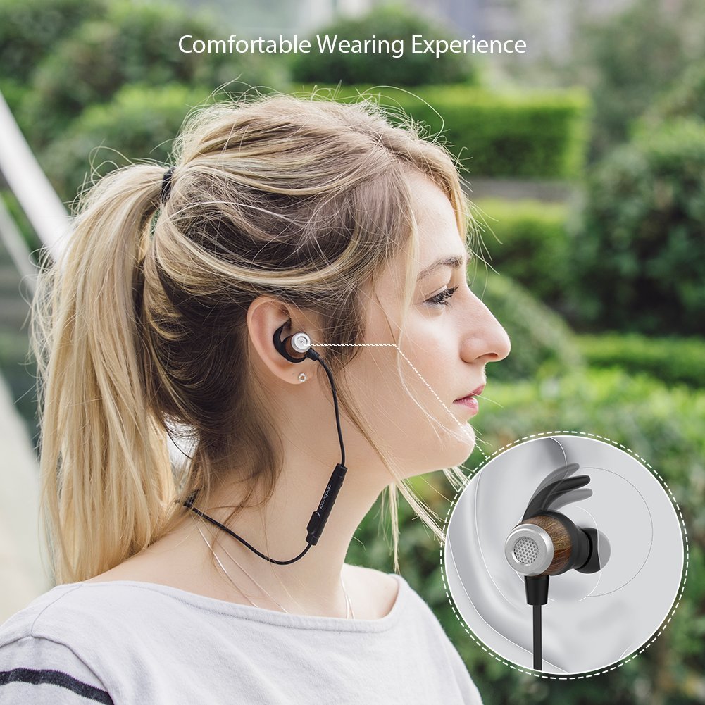 Its built-in magnetic design allows users to attach the two earphones together and don them as a necklace around their neck. Moreover, dodocool Wireless Stereo Wood in-ear headphone is water and sweat-resistant.