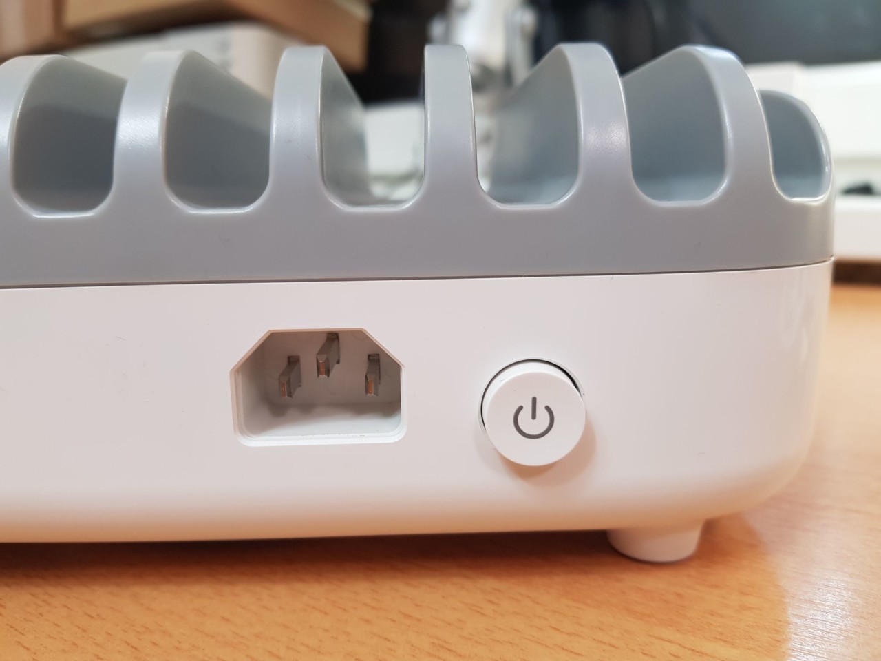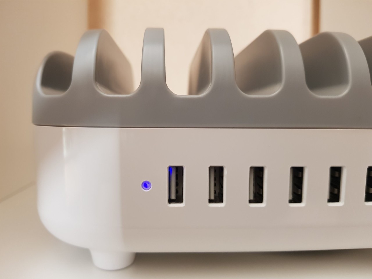 On the bottom, the rubber pads prevent the device from sliding on the table. Finally, there is a smart cooling system, which senses if the charging station reaches a high temperature to automatically shut it down. It has never happened to me even if I charged all 10 devices at the same time, meaning that the station does not overheat.