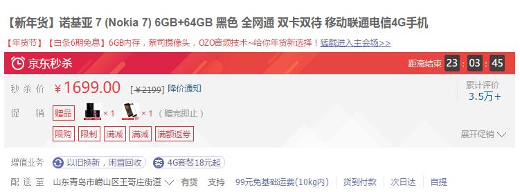 Two weeks ago, the retailer had introduced a discount of 900 Yuan (~$142) on the 4 GB and 6 GB RAM variants of the Nokia 7. Both the variants were launched with respective pricing of 2,499 Yuan and 2,699 Yuan, but their pricing were recently reduced to 1,599 Yuan (~$252) and 1,799 Yuan (~$284). Updated listing of the 6 GB RAM variant now shows that the retailer has further slashed its price by 100 Yuan (~$15.8) as it is now selling for 1,699 Yuan.