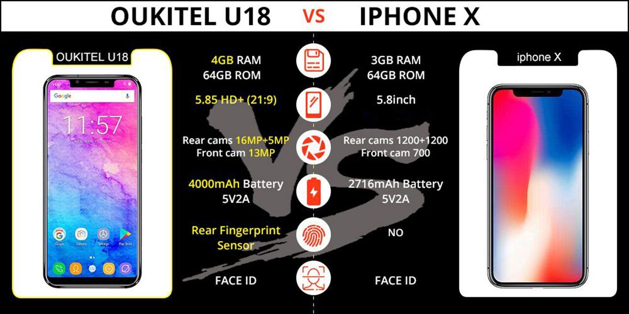 OUKITELĀ U18 is a chip off the old block as it looks very much like the iPhone X in terms of the design. It resembles the iPhone X in its entire design, packing a full-screen design, and a similar notch at the top of the screen like the one found on Appleās flagship X which is meant to house the front speaker and selfie shooter. Some of the differences between both models are that unlike iPhone X, theĀ OUKITEL U18 features a 5.85-inch 21:9 display to make the body looks slimmer. And to match the 21:9 display, OUKITEL chose a MediaTek MT6750T octa-core chipset as the MT6750 processor can only drag 18:9 display. The U18 also features 4GB of RAM and stable Android 7 OS, OUKITEL U18 offers super comfortable and fluent handling experience.
