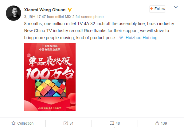 The Mi TV 4A 32-inch model was launched clutching a 1,099 Yuan price tag (around $163). That price was later reduced further in October last year to 999 Yuan (~$150) with an offer of free shipping within Mainland China. This price reduction may have contributed to the increased sales that have been recorded.