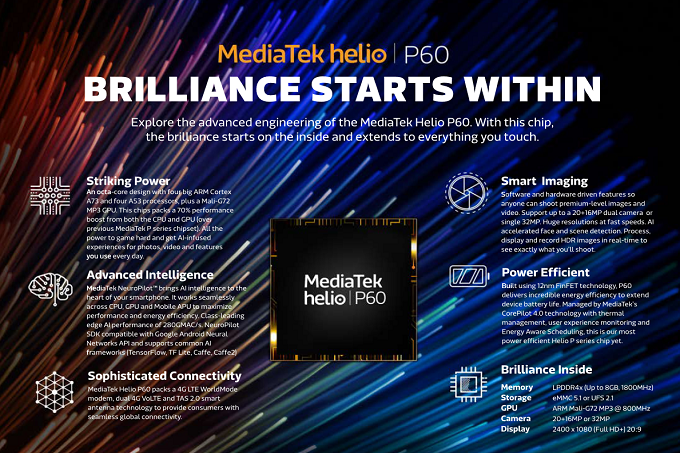 The MediaTek Helio P60 is built on TSMC’s 12nm FinFET process which offers 15% reduction in power consumption over 14nm chips. The octa-core chip clocked at 2.0GHz uses four Cortex A73 cores with a 2.0GHz clock speed and four Cortex-A53 cores also clocked at 2.0GHz. It also boasts of a new Mali-G72 MP3 GPU clocked at 800MHz which Mediatek claims offers a 70% boost in game performance over previous generation P-series. Like other chip manufacturers, MediaTek has also included a dedicated processing unit called NeuroPilot that handles AI-related tasks on the device. It is two times more power efficient than using a GPU and has a processing performance of 280GMAC/s. NeuroPilot will handle tasks like deep-learning facial detection, object and scene identification, real-time beautification and AR/MR acceleration. The chipset also supports a dual camera setup up to 24MP + 16MP or a single camera with a 32MP sensor.