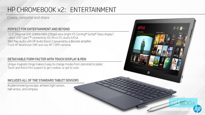 According to the U.S. giant, users will need just one hand to connect the device to its detachable keyboard thanks to its high-quality magnetic dock. The display has a size of 12.3 inches with IPS LCD technology, and it shows images at a 2K resolution of 2400 x 1600 pixel (235 ppi of pixel density). It is protected by Gorilla Glass and it supports pen input for handwriting and drawing. Under the hood, it boasts an Intel Core M3-7Y30 CPU, 4 GB of RAM and 32 GB of internal storage. The company also offers 100 GB of free storage on Google Drive for two years. HP Chromebook x2 will launch in the U.S. market in June with a price of $599.