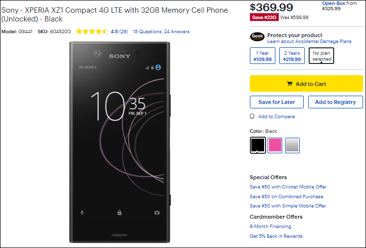 Sony Xperia XZ1 Compact was launched alongside the Xperia XZ1 at IFA Berlin 2017. That means the device is just 9 months in the market, not even up to one year but its price has seen a sharp drop and is presently sold for $369 on Amazon and Best Buy. The present price is a massive $130 off the original price of the compact flagship that is if we assume it retails for $500. Both retailers list the original price as $600 which means it gets $230 off its price!