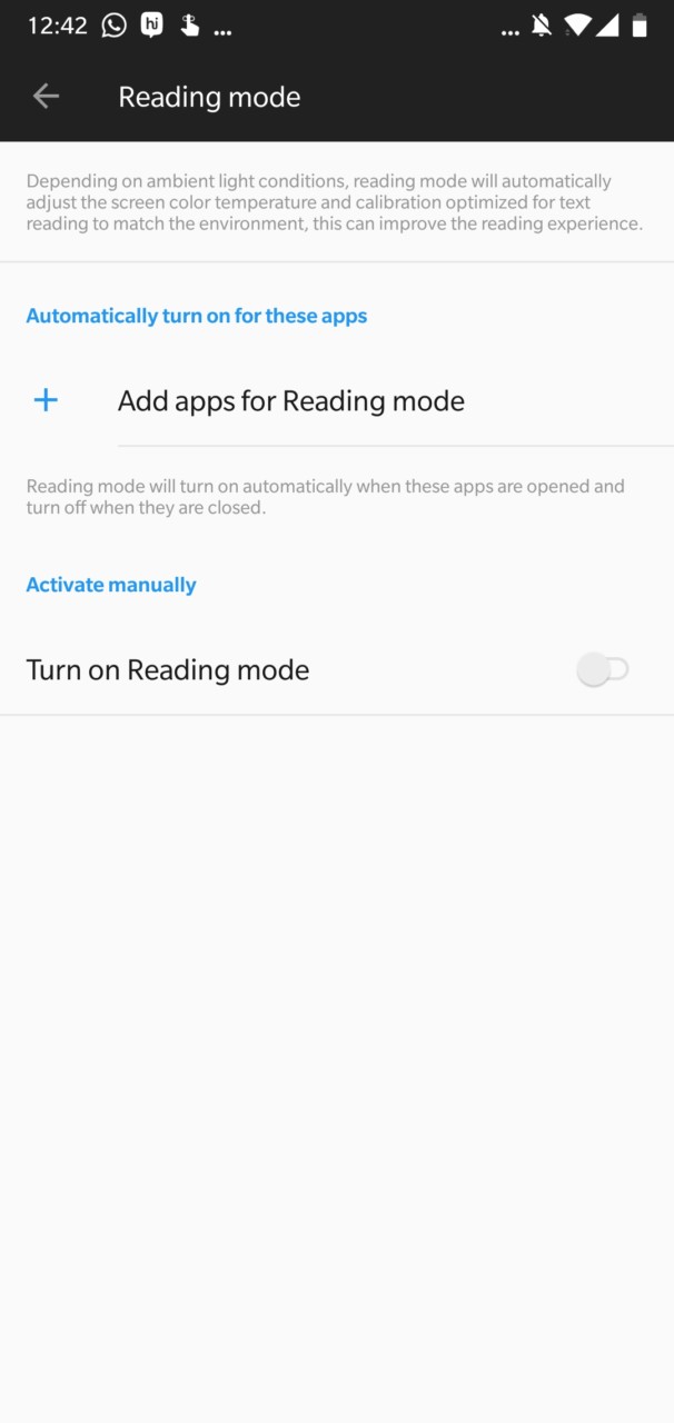 If you are set for a reading spree on the OnePlus 6, you can turn on its special reading mode (available on the quick settings panel) which will automatically adjust the screen temperature and calibration for optimum reading experience. You can either manually turn it on from the settings or you can assign specific apps which will turn on this feature automatically.
