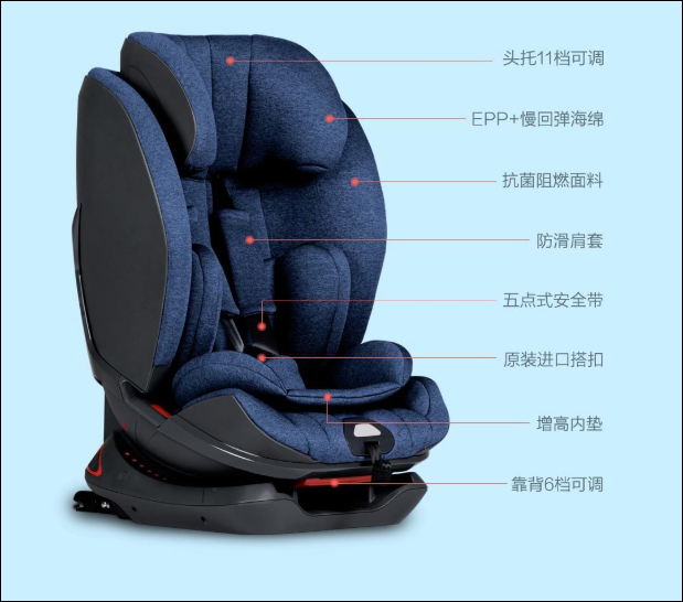 The part that comes into contact with the child’s body is a slow-rebound sponge combined with a high energy-absorbing EPP material. When pressed, the honeycomb structure is subjected to a multilateral force to absorb energy and effectively relieve the impact caused by the collision. The backrest supports 6-speed adjustment, while the headrest supports 11-speed adjustment. The seat is fixed at three different points to the car seat with a design which guarantees solidity. There is a five-point seat belt which can cover all the key parts of the baby’s body. It is distributed from the shoulders, waist and buttocks and give racing driver-class protection.