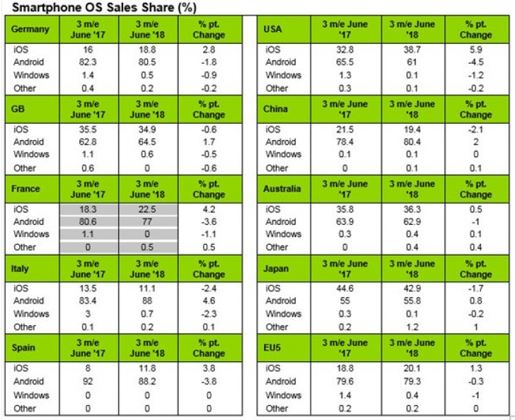 Kantar report also shows that Android has gained more ground in China and Great Britain but has lost a bit in Germany, France, Spain and the US if compared to Q2 of 2017. It shows that Andriod still retains 80.5% in Germany, 61% in the US, 64.5% in the UK and over 80% in Italy, Spain, and China. The Huawei P20 Pro performance in the UK this quarter has been marvellous, and this can also be an attribute of the boost of Android in the UK. If compared to last year report, Huawei’s UK market share boosted from 2.7% in Q2 of 2017 to 13.7% in Q2 of 2018. Also, Huawei is another major player in the Android’s OS share expansion in China as well.