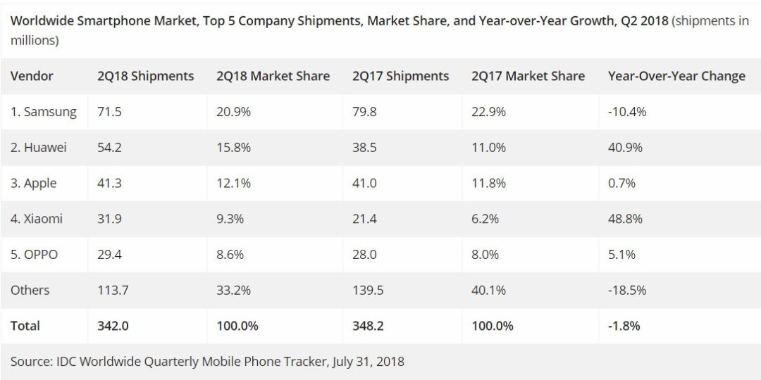 IDC released its Q2 2018 smartphone shipments and market share data earlier today revealing Huawei has finally overtaken Apple to become the second largest smartphone company in the world. However, the data further points out that Xiaomi was the fastest growing company in the same quarter, with a YoY growth rate of 48.8%.