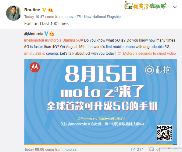 The company released a promotional video which is a short clip of fans speaking about what they like about the smartphone. Obviously, the major feature mentioned and which Motorola is using as its major promotional tool is the 5G feature. In case you forgot, the Moto Z3 comes with a 5G Moto mod which means the device is the first 5G upgradable smartphone. Lenovo’s President added his voice that the 5G technology is 100 times faster than the present 4G. Suffice it to state that this feature could become useful in China first before Verizon unveils its 5G framework since China is well ahead to roll out its 5G infrastructure before the U.S.