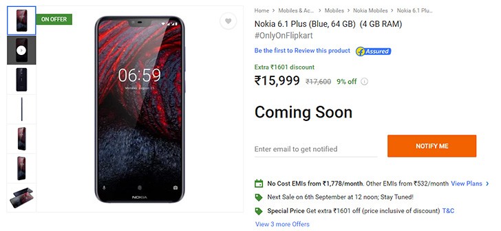 The Nokia 6.1 Plus smartphone was scheduled to go on sale in India yesterday at 12 pm local time via Flipkart and Nokia online store. Indeed, the new Nokia 6.1 Plus went on its first sale and it was a hot one. The device was sold out in less than 3 minutes on Flipkart as the phone was out of stock by 12.03pm.