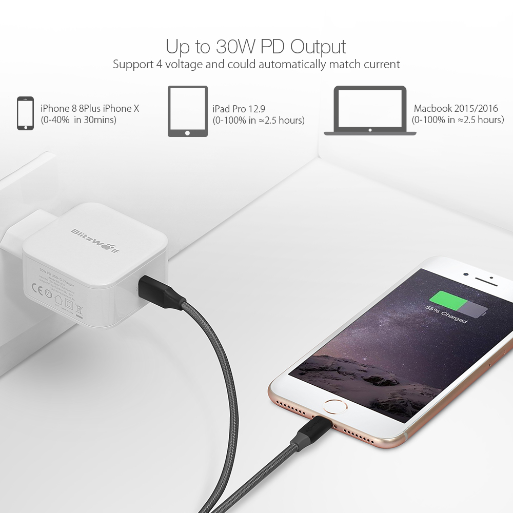 The BW-S10 30W PD charger works with iPhone 8, iPhone 8 Plus,iPhone X and switches fast charging up to 15W (PD for 15V~1A ). It supports PD(Power Delivery), BC1.2, QC2.0 and QC3.0, which is compatible with a wide range of fast charging devices.