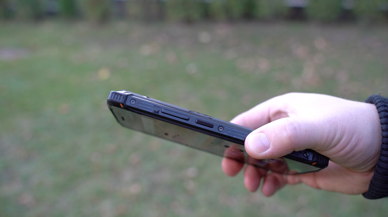 The device has a nice aluminum rail with chamfered edges that goes all around the device. The top and bottom of the phone are made of shock-resistant rubber. The USB-C power port is covered with a flap. Unfortunately, the phone does not have a headset jack. The overall build quality is very good. The phone feels sturdy, the buttons are nice.