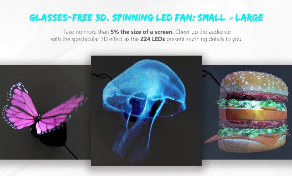 In order to use it, all you need to do is to copy any black background video into the holographic LED fan and it will deliver an animated 3d advertising display for your audience to gaze at. Since the image it creates is borderless and has no backgrounds, it appears as if the 3d advertising display is in the air.