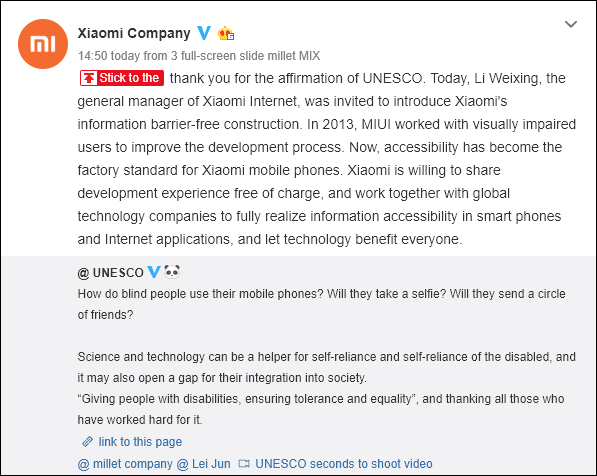For its continued efforts in this regard, the United Nations Educational, Scientific and Cultural Organization (UNESCO) has reportedly lauded Xiaomi’s efforts in ensuring that persons with disabilities are given equal opportunities to b able to utilise technology which also ensures they are fully integrated into society. The UN agency did this in a post on its official Weibo account. The post also had Xiaomi’s official Weibo account as well tas that of Lei Jun as mentions. The post also contains a video which demonstrates how visually impaired individuals are able to use Xiaomi smartphones. Xiaomi’s CEO Lei Jun was quick to respond to the recognition by UNESCO. Here’s his response- “Thanks to the UN’s recognition of Xiaomi’s work. We will always insist on making friends with all users and continue to invest in information accessibility, truly enabling everyone in the world to enjoy the beautiful life brought by technology”.