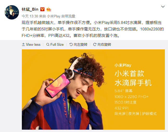 Earlier today, the official images of the Dream Blue and Gold Dawn gradient color variants of the Mi Play handset were released Xiaomi President Lin Bin. Speaking of Bin, he has also shared another image (shown below) through his Weibo to confirm on the key features of the smartphone.