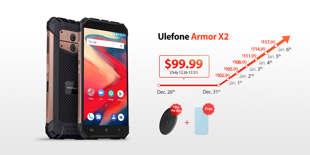 As stated, the Ulefone Armor X2 is presently on pre-sale for $99.99. This price will be sustained from December 26 to December 31. However, from January 1st, the price will start increasing by $3 each day until January 6 when the price will berth at $117.99. So, why not get the Armor X2 at the lowest price now The device is bundled with a free protective film as a gift. In addition, there will be a draw where a customer can win a free UF002 wireless charger. All buyers have to do is to send their Armor X2 order information to [email protected]. Follow the link to pre-order the Ulefone Armor X2.