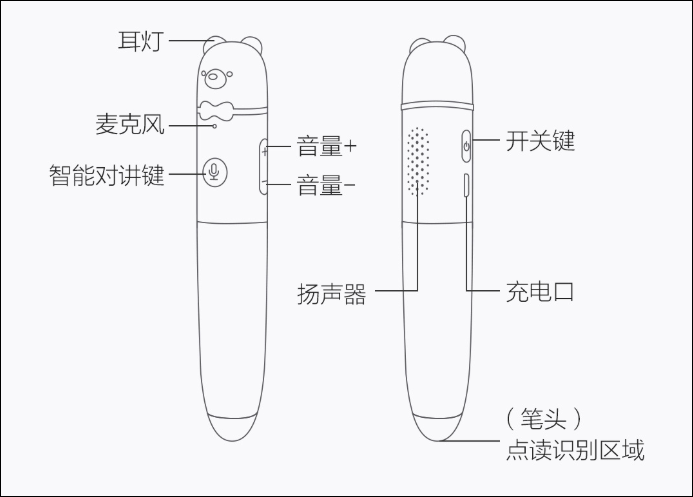 As for the design, the pen is shaped like a regular pen but with a robust build and design like a small teddy bear putting on a bow tie. The butt assumes the shape of a head with two antenna lights that looks like ears. There is an aperture for a microphone at the top half just under the bow tie. Just under the mic is a smart intercom key. The volume control buttons are at the side of the intercom key while at the other side is the power button and USB charging port. The device has some grills at the back housing the speaker. The design is done to make the gadget usable like a walkie talkie. Finally, the tip is actually the reading recognition area and cannot produce any ink for writing. The pen will be available in blue and pink colours.