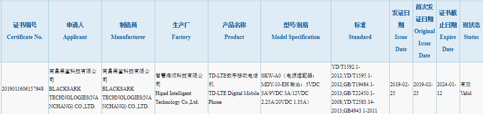 The 3C approval of a new Black Shark phone with model number SKW-A0 confirms that it will be shipped with 27W charger (MDY-10-EH model number). It is the same charger that is included in the retail box of the Xiaomi Mi 9. Apart from the charging rate of the device, it 3C listing does not contain any other information.
