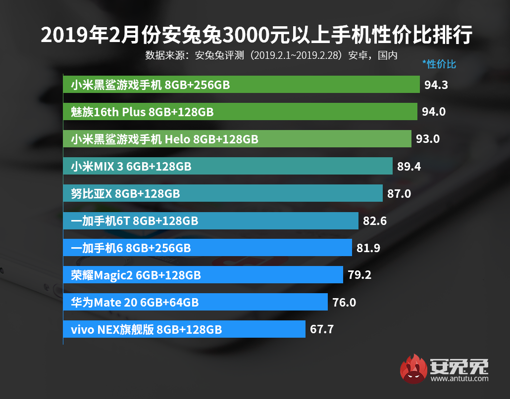 The 3,000+ Yuan (~$450+) list includes 8 GB + 256 GB Xiaomi Black Shark with 3,099 Yuan (~$460) price tag, 94.3 VFM score and 292,136 AnTuTu score on the first position. The 8 GB + 128 GB Meizu 16th Plus is second with 94 VFM score and 291,264 AnTuTu score. It carries a price tag of 3,098 Yuan (~$460). The 8 GB + 128 GB Black Shark Helo that costs 3,199 Yuan (~$477) is placed on the third position. Its VFM score is 93 and AnTuTu score is 297,473.