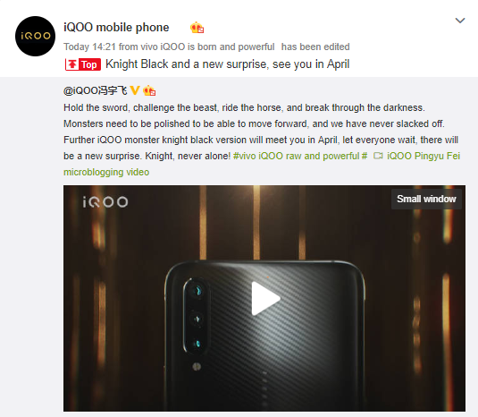 During the unveil event of the Vivo iQOO gaming phone, the company had confirmed that it will be releasing in four variants such as 6 GB RAM + 128 GB storage, 8 GB RAM + 128 GB storage, 8 GB RAM + 256 GB storage and 12 GB RAM + 256 GB storage. Except for the 12 GB RAM variant that was dubbed as monster version, all the other variants of the iQOO gaming phone have been available for purchase. Today, iQOO brand Vice President Feng Yufei has confirmed through his Weibo account that the company will be releasing iQOO Monster Knight Black version in April.