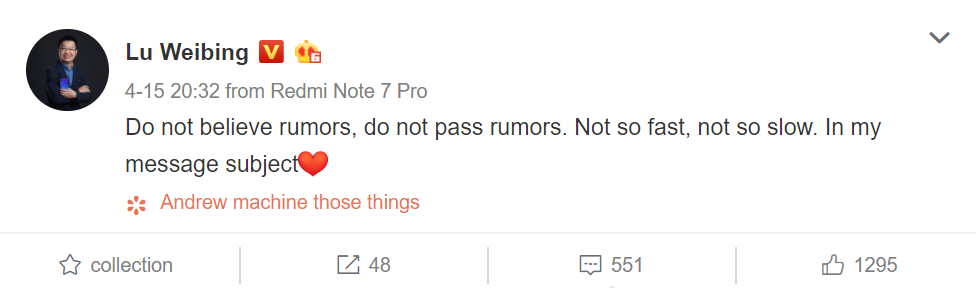 In the below shown screenshot, Weibing has claimed through Weibo that fans should not be believing and circulating rumors. The “not so fast, not so slow” translated text in his Weibo post is being related by the Chinese media to the release date of Redmi SD855 flagship phone. In other words, it is now being speculated that the launch date of the smartphone may not be far away.