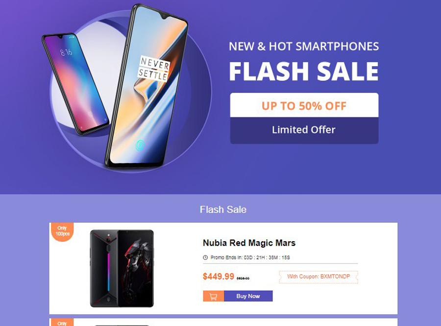 For instance, the Nubia Red Magic Mars smartphone that usually retails for $625.99 can be yours for a reduced price of just $449.99 if you order it from the promotion page. Moreover, first 100 buyers can extend this 27 percent discount by using coupon code BXMTONDP and get an extra $66 off.