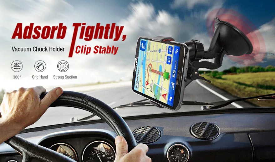 This holder enables you to use your phone while driving without anxiety. It has strong suction 5.7cm vacuum chuck, paired with an extra large clip that can be attached either to the windshield or any other smooth area.