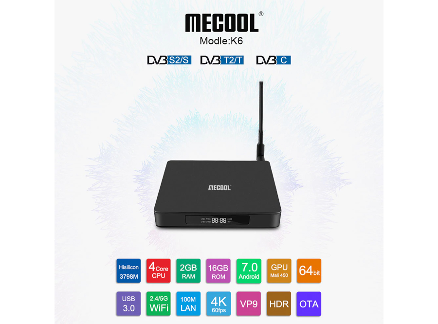 The MECOOL K6 runs Android 7.0 Nougat operating system. It supports 4K ultra HD image display and H.265 decoding. Moreover, it offers 2.4GHz + 5GHz dual-band WiFi in terms of connectivity.
