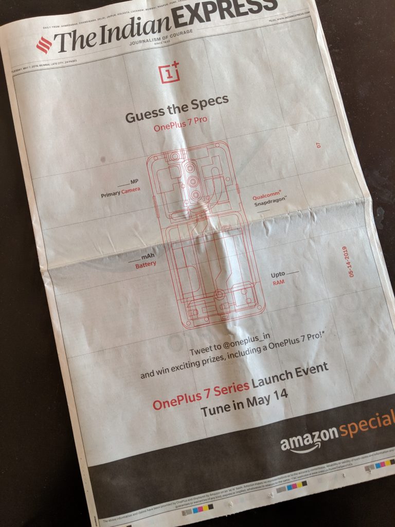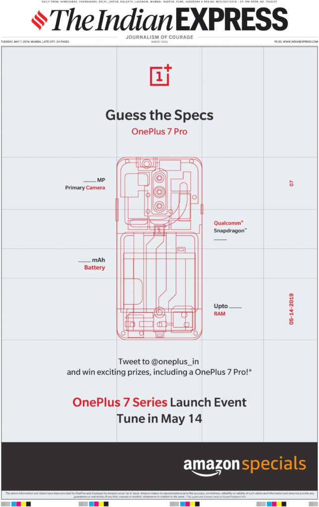 Leading newspapers across India today are running a new advertisement of the upcoming OnePlus flagship smartphone. The ad wants user to guess the specifications of the OnePlus 7 Pro. The contest that will be ending tomorrow will allow users to win exciting prizes including the OnePlus 7 Pro smartphone.