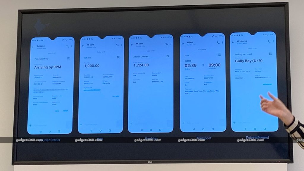 Next, we have the Smart SMS app. How we understand it, the app will identify different types of service SMSes, be it bills, banking, transport, etc. It will then categorize them and display the relevant information accordingly. For example, an SMS from a courier will have the ETA for the arrival and contextual buttons to track your package. OnePlus claims the app can identify 39 different types of service messages, impressive!