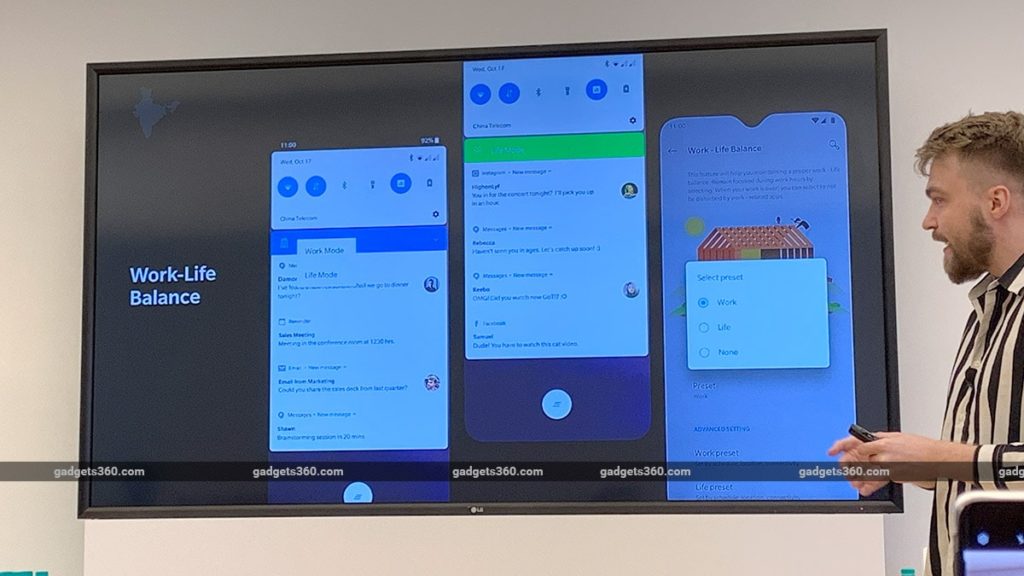 Perhaps the most interesting feature in the lineup, Work-life Balance is essentially a time and lifestyle management app. It lets you record when you go to and leave from work, and accordingly lets you choose what notifications you see both the times. You can block social media notifications at work, and hide work emails at home. You can categorize apps under ‘Work’ and ‘Life’, and see how much time you’ve spent on both via a bar chart.