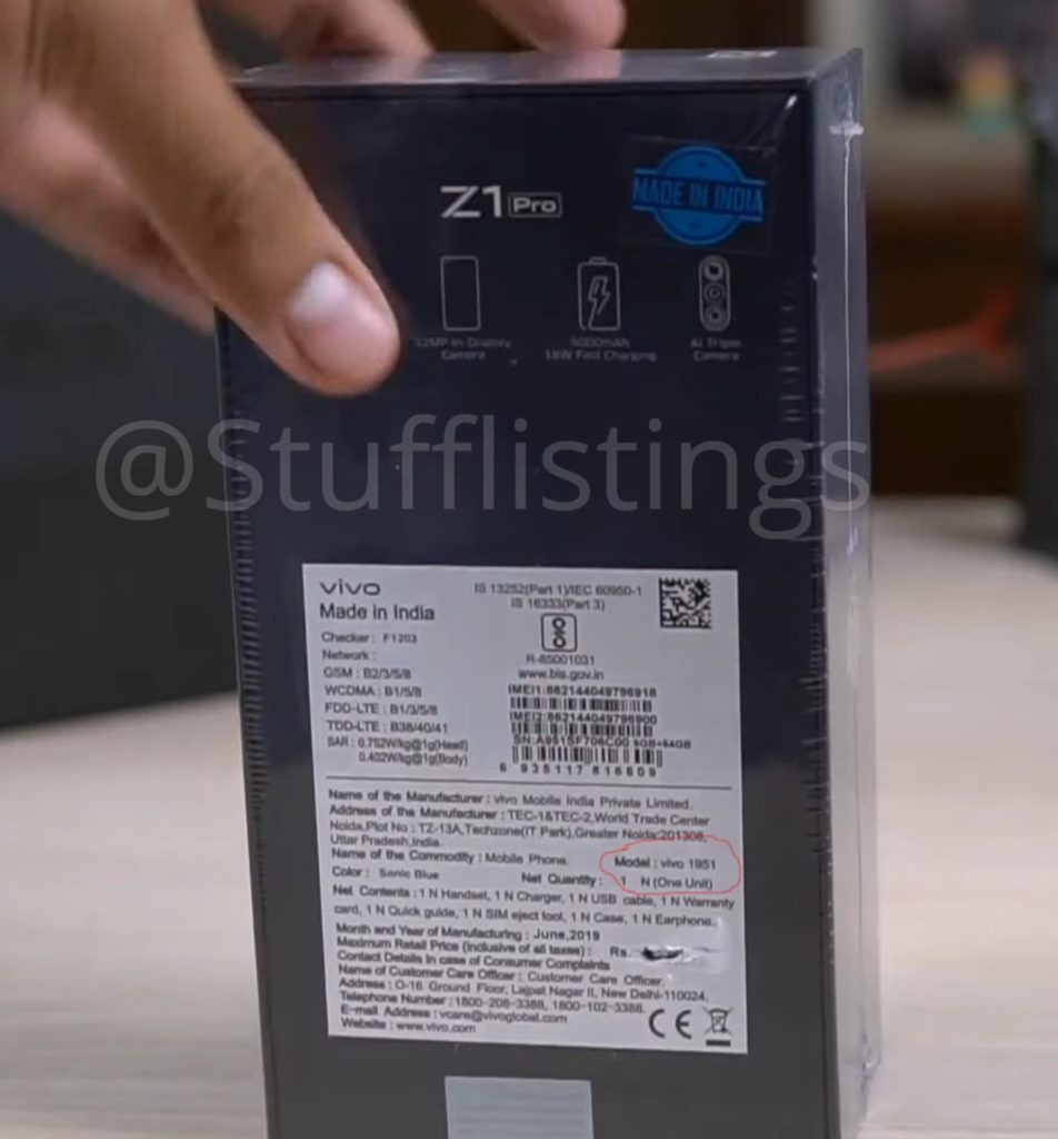 UPDATE: An image of the retail box of the Vivo Z1 Pro been shared by Mukul Sharma. The Vivo 1951 model number mentioned on the box confirms that it is indeed the Vivo Z1 Pro smartphone.