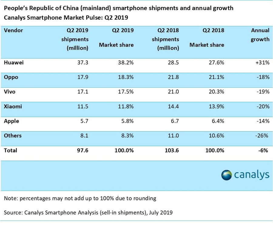 Huawei, despite the recent ban, has extended its lead in a declining China smartphone market in the second quarter of 2019, with its market share rising to 38% as all other top vendors lost ground. The company shipped 37.3 million smartphones in China in the second quarter, up 31% year-on-year, according to Canalys. Its market share rose more than 10 percentage points from the year-ago quarter’s 27.6%.