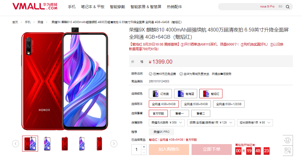Honor 9X and Honor 9X Pro mid-range smartphones were made official in July. The Honor 9X was introduced in three color options such as Magic Night Black, Charm Sea Blue (Phantom Blue) and Flame Red (Phantom Red). Even the Honor 9X has been available for purchase since July 30 in China, the Flame Red model was not released. The Vmall listing of the Honor 9X reveals that its Flame Red edition will be go on sale at 10:08 AM (local time) tomorrow in China.
