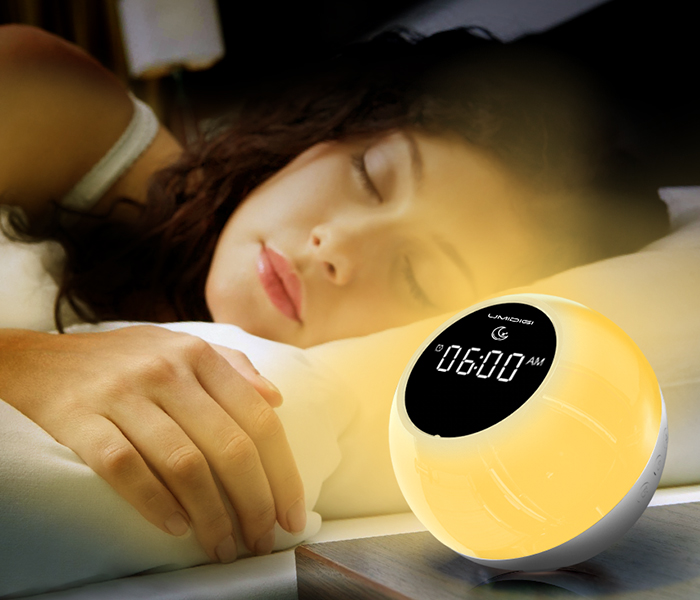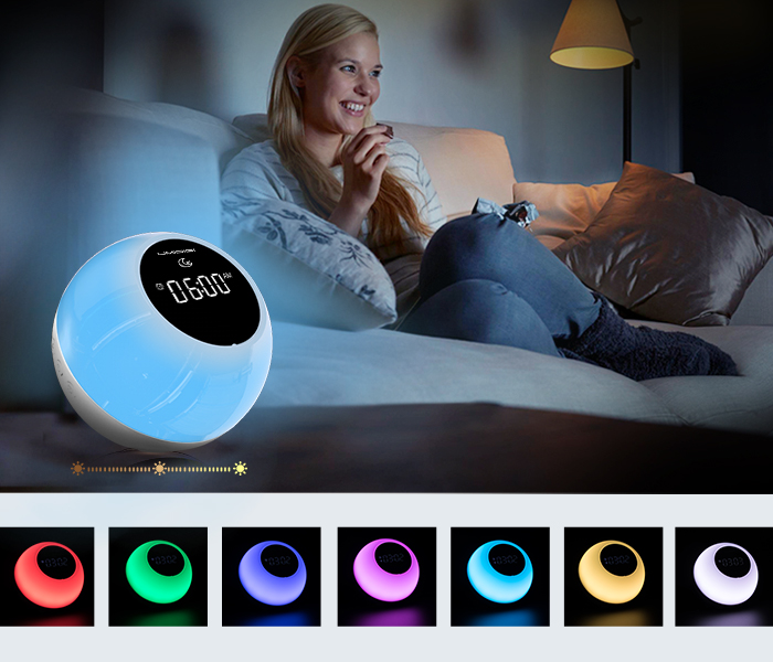 In addition, the Uwake doubles as a lamp and alarm clock. There are 7 kinds of color atmosphere lights and 2 lighting modes. To cycle through the colors you can use the buttons on the side. As for the alarm clock function, the Uwake supports simulated sunrise wake-up with 3 levels of brightness and can wake you up with a glow of soft light, meant to mimic the rising sun, and slowly get brighter. What’s more, it can help you fall asleep as well as it features 6 built-in sleep-themed tunes with choices of birds, rain, waves, and other relaxing sounds.