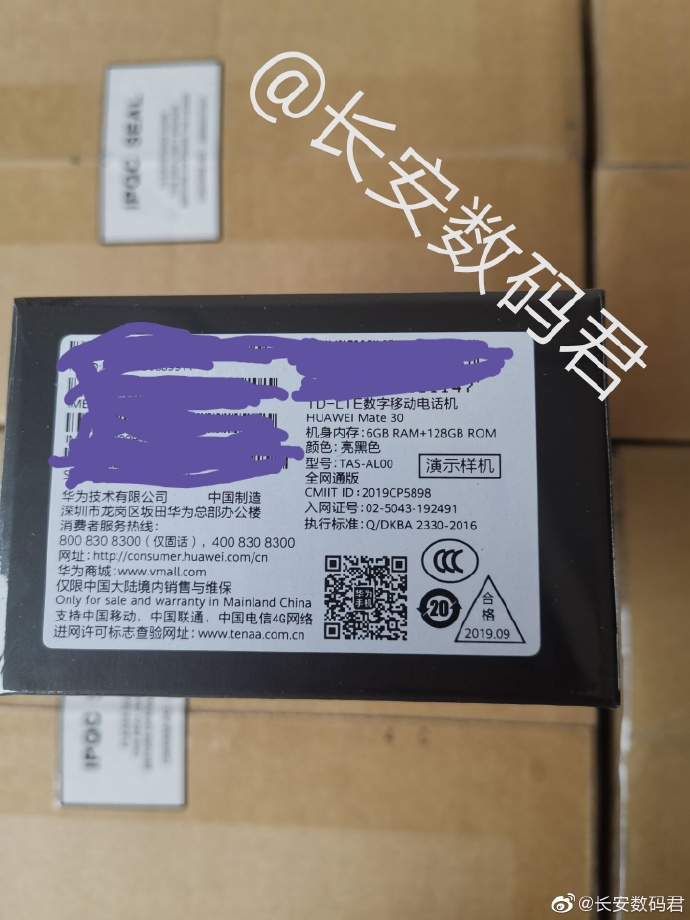 The sticker on the side reveals the Mate 30’s model number is TAS-AL00 and this version has 6GB of RAM and 128GB of storage. This was the highest configuration available for last year’s Mate 20 but we can’t say if that will be the case again this year. Nevertheless, there should be support for storage expansion via Huawei’s proprietary Nano Memory card slot.