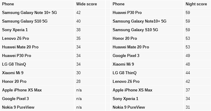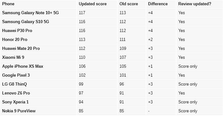 DXOMark has tested several phones using the new test protocols and as such, the reviews of phones with either of the features have been updated. The scores have also been recalculated, altering the standings. You can check out the updated scores from the table above. We should emphasize that the Samsung Galaxy Note 10+ continued its dominance of the top spot after the recalculation.It’s score sawan increase of 4 points from 113 pints to 117 points. In terms of specific score, it tied with the Huawei P30 Pro and Galaxy S10 in the Night mode test. For the ultra-wide-angle camera test, the Galaxy Note 10+ sood apart from the pack.