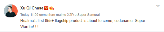 UPDATE: Realme CMO Xu Qi has also used the unreleased Realme X2Pro to add a new Weibo post. The post shown below reads that Realme’s first Snapdragon 855+ powered smartphone is coming and it is codenamed as ‘Super Warrior.’