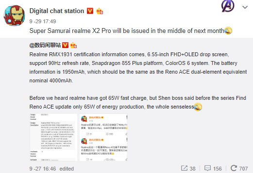 The Weibo posts from Derek indicates that the company could be gearing to launch a Snapdragon 855 Plus powered flagship phone. A reliable tipster from China has claimed that the Realme X2Pro will break cover in mid-October.