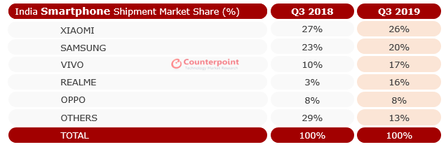 Counterpoint Research has recently published its report about the Indian smartphone market in the Q3 of 2019. While all other market segments are observing a slowdown, smartphone sales broke previous shipment records with combined sales reaching 49 million units. The report highlights that the growth can be accredited to new launches, heavy discounts on existing models during the pre-Diwali sale.