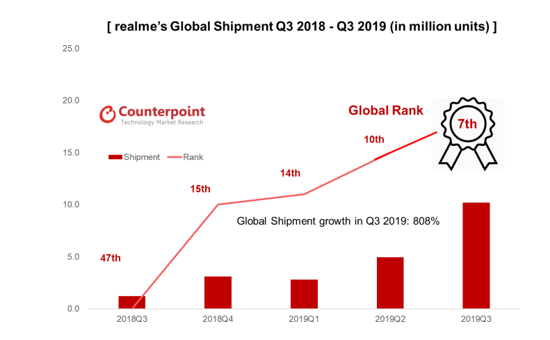 Over the past year, Realme has been churning out value for money smartphones across a number of price segments. Most Realme devices have gone head to head with Redmi’s bestsellers, and more often than not, it has managed to grab a chunk of Redmi’s market share in the segment. The company’s immense growth is now visible in terms of shipment numbers as well. Today, Counterpoint revealed that Realme shipped more than 10 million units in Q3 2019.