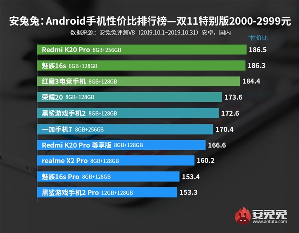 The most cost-effective model in this price segment is the K20 Pro 8 GB+256 GB, followed by Meizu 16s 6 GB+128 GB and gaming centric Red Magic 3 8 GB+128 GB variant. All three models are equipped with the Snapdragon 855 SoC which is 7 nm fabrication process. The lowest value for money offering handset based on benchmark results is the 12 GB + 128 GB variant of the Xiaomi Black Shark 2 Pro.