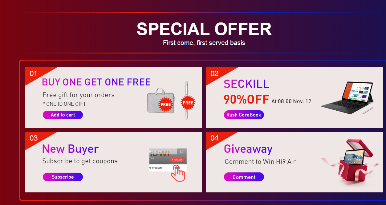 In addition, a 90% Seckill will take place on November 12th at 8.00 and will be available for just a few minutes. If you are fast enough, you can get the Chuwi CoreBook 2in1 tablet with 8GB RAM at a fraction of the price it really costs. Lastly, there will be a Giveaway for the Chuwi Hi9 Air. To see all the details about the big event from Chuwi, visit the promotion page.