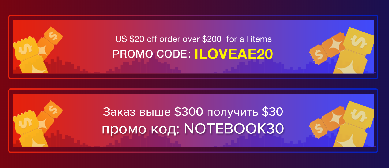 As you can see in the photo, using coupon ILOVEAE20 will give you $20 off if your items cost more than $200 and using coupon NOTEBOOK30 will give you $30 off for items costing more than $300.