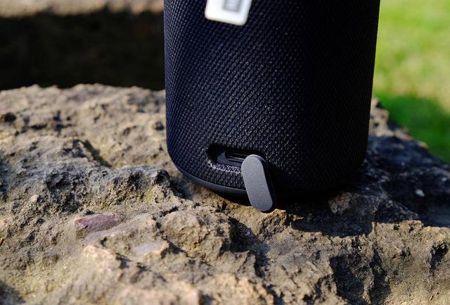 At the bottom edge, there is a USB-C port which delivers fast charging. The charging port has a rubber cover to aid the waterproof feature. The speaker as IP55 waterproof and dustproof protection.